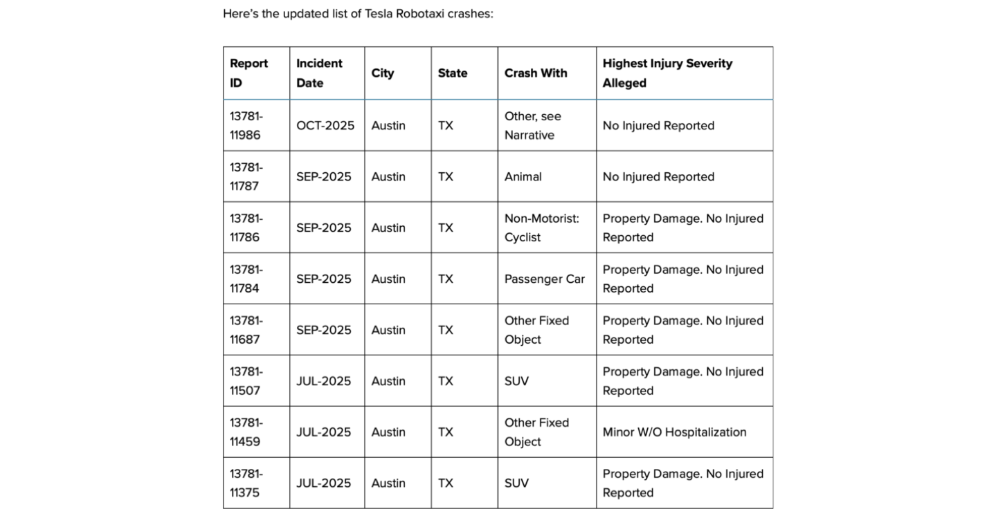 The Supervisor Paradox: Critically, these eight crashes have occurred “with a human safety supervisor in the driver’s seat (for highway trips) or passenger seat, with a finger on a kill switch.” These employees are trained to prevent accidents. Despite this, CEO Elon Musk recently claimed that Tesla would “remove safety monitors from the Robotaxi fleet” in Austin within “three weeks,” and testing without a supervisor has already begun.