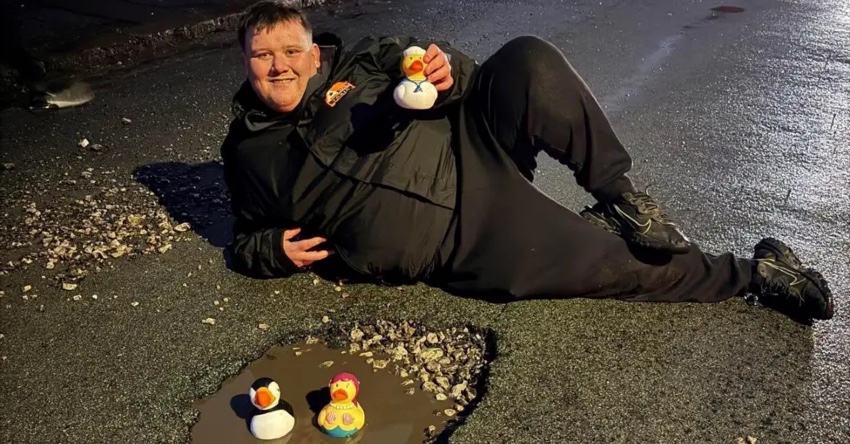 Shaine Tench, director of A Star Taxis, placed three rubber ducks into a water-filled pothole, joking that the toys "were having the time of their lives" while trying to make the road "look more pretty."